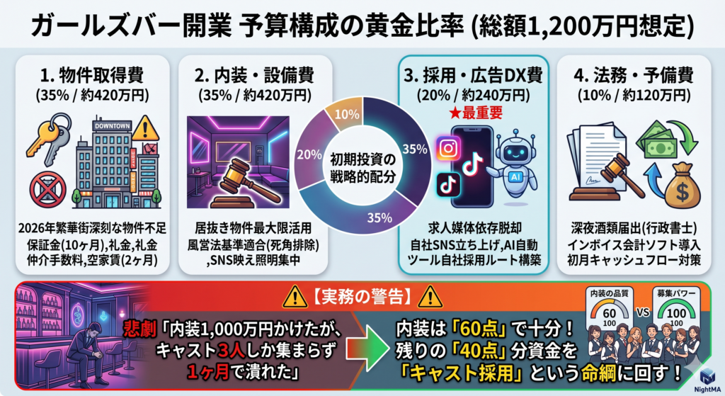 実際、現場では「内装を1,000万円かけて豪華にしたが、キャストが3人しか集まらず1ヶ月で潰れた」という悲劇が絶えません。内装は60点の仕上がりで十分です。残りの40点分の資金を「キャスト採用」という命綱に回してください。