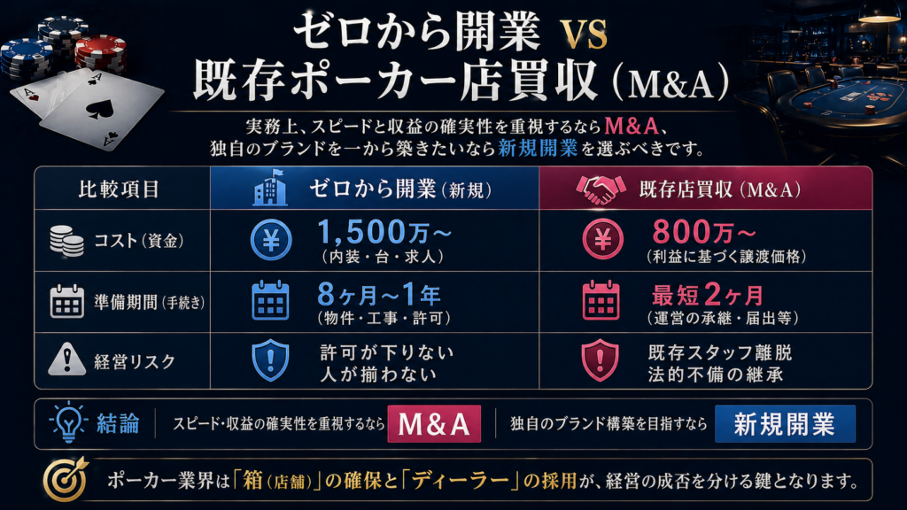 【徹底比較】ゼロから開業 vs 既存ポーカー店買収(M&A)